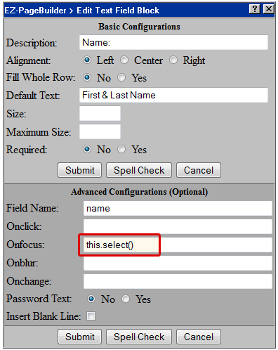 If you think the user is likely to go back and edit the field (like an address field for example) consider using this code. It only removes the text the first time (so it will never remove what the customer typed). Onfocus: if(!this._haschanged){this.value=''};this._haschanged=true;