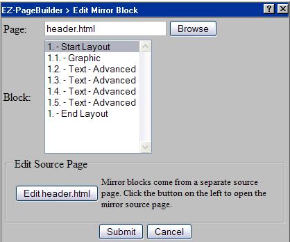 3. Browse for the newly created mirror block page. (header.html in our example)