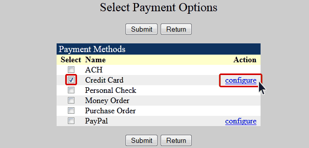 : If Authorize Net is already selected, just click configure to enter ID and Transaction key.)