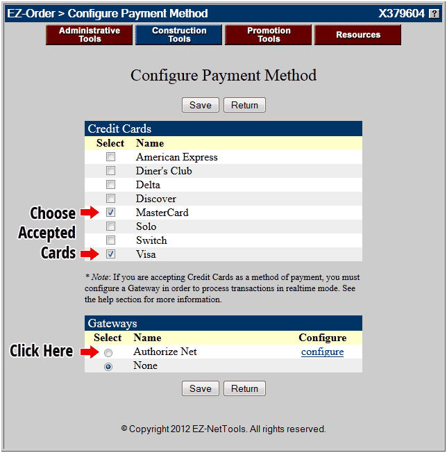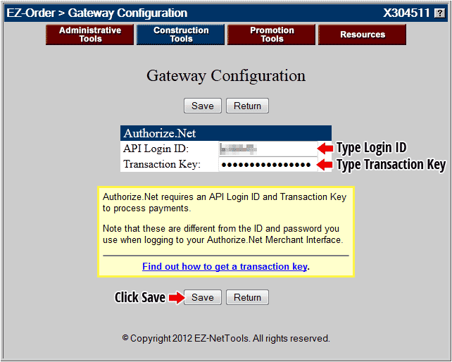 Once you sign up with Authorize.Net, you will be provided an API Login ID and a Transaction Key. You will use these to setup your gateway with EZ-NetTools.
