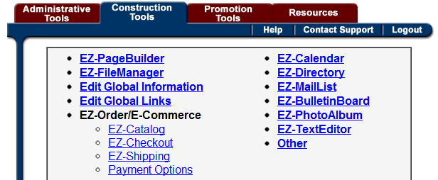 Administrative Tools Used in the standard course of business, handles transactions, sets up email accounts, edits company information, and much more. Construction Tools Used to create or modify the structure and contents of the Web site. Promotion Tools Used to improve the public visibility of your web site. Resources Various resources to help you design and manage your website and your business. This includes on-line help text, on-line magazines, on-line courses, links, and other features.