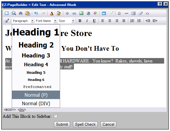 Go back into the text block. Let's add a paragraph... Highlight the text. Click Paragraph. Choose Normal (P).