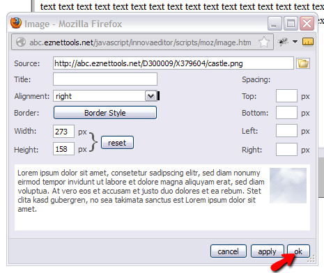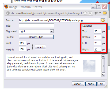 Just click the image agian, then click the "image" button at the top to bring up our image window again. On the right you see where you can add spacing on each side of the image. Here I put 20 pixels of space all around the image.