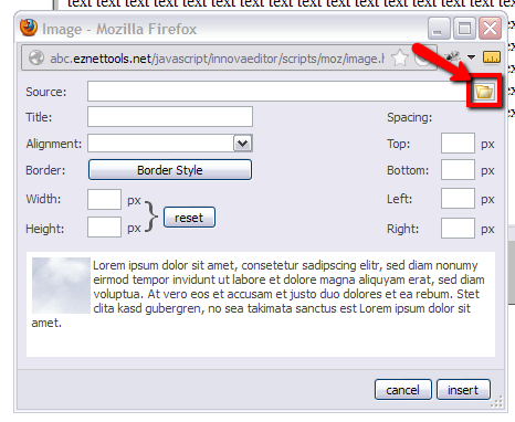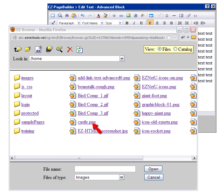 The "Browse" button opens the EZ-Browse window, where you can find and select your image file (The file must be uploaded to the server). Then click "Open"