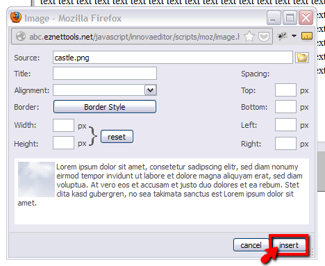 Now you see the image file in your "Source" field. To complete the process, click the "insert" button.
