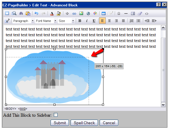 This is where the Text Advanced Block makes working with images easy, to change the image's size, just simply grab an edge or corner and drag to make it smaller or larger.